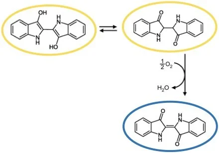 Leucoindigo is a bright yellow molecule. It’s almost insoluble at neutral pH, but quite soluble at high pH (with a strong base). If you’ve ever played with an indigo vat, you’ve seen this molecule before. As you might guess, we’re very close to what we’ve come for. All we need is a bit of rearranging and some additional oxygen to get…