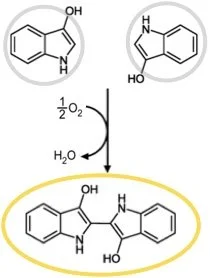 When we crush a leaf with our fingers, vacuoles and chloroplasts break and their contents combine. The enzyme encounters indican molecules and begins to cut them apart into indoxyl and glucose molecules. Oxygen from the air (maybe freshly made by a neighboring leaf) reacts with two indoxyl molecules to form leucoindigo. At the neutral pH of the leaf juice or on the slightly acidic surface of your skin, this three-way reaction can take a little while to happen. But these conditions are perfect for the beta-glucosidase enzyme to keep making indoxyl from any indican within reach, and all that indoxyl piling up starts to make the reaction a bit faster as we keep waiting.